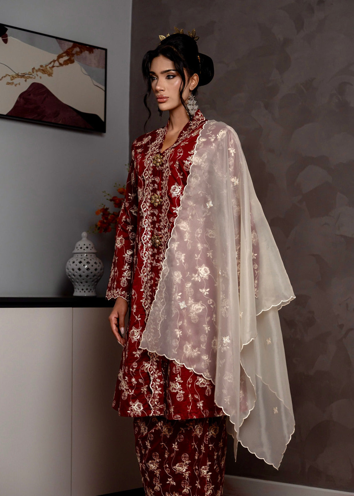 Paired with a matching sarung skirt, Qaseh Kebarung flows with quiet sophistication, complemented by a sheer scalloped organza shawl that drapes softly for an ethereal finish. Every detail reflects warmth, femininity, and nostalgia — perfect for intimate Raya mornings and elegant open houses alike.